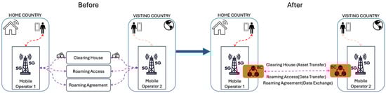 As previously discussed, the five schemes presented primarily concentrate on the interoperability between two blockchain networks. However, when the interoperability extends to encompass three or more blockchain systems, the complexity of the process significantly increases. This complexity is particularly relevant in scenarios such as end-to-end enterprise processes that traverse multiple blockchain environments. Belchior et al. called this scenario type a blockchain of blockchains (BoB) [46]. Figure 7 illustrates an international roaming use case where a decentralized, intermediary-free process is developed with blockchain interoperability. As seen on the left side of Figure 7, most telecom operators use clearing houses to facilitate the reconciliation of roaming records for their users in the visiting country. By implementing a direct interoperability architecture, clearing houses can be eliminated, as illustrated on the right side of Figure 7. This scenario can be viewed as a unified process between two or more operators. Once the blockchain networks are established for direct interoperation among multiple telecom operators, the process can be described as a BoB.