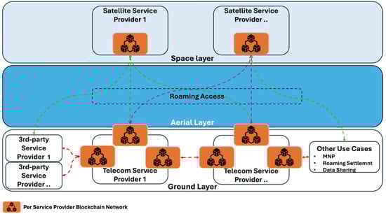 Decentralized interoperable blockchain platforms can optimize roaming services through providing transparent, intermediary-free, and real-time settlement mechanisms between telecom operators. A candidate blockchain solution can use smart contracts as preset roaming exchange rules and automatically apply the process if a roaming service is triggered in the visiting country. Finally, it calculates the roaming fees without an intermediary, such as a roaming clearing house. Salah et al. [29] discussed roaming as an opportunity in 5G, which can be addressed using blockchain. They discussed international and national roaming, in which blockchain can improve the quality and experience of roaming services. According to Salah et al., blockchains help to reduce costs and fraud, improve billing accuracy, and enhance the overall user experience of international and national customers. The Global System for Mobile Communications Association (GSMA) [30] has already developed the “GSMA eBusiness Network” [31] using a private, permissioned, industry-wide blockchain network. This blockchain solution focuses on wholesale roaming, clearing, and settlement as the industry’s first application. With the introduction of the 6G SAGIN architecture, roaming services are expected to become more complicated and subject to privacy leakage if privacy and identity requirements are not considered. According to [24], roaming fraud is expected in 6G networks due to their increased complexity and interoperability requirements.