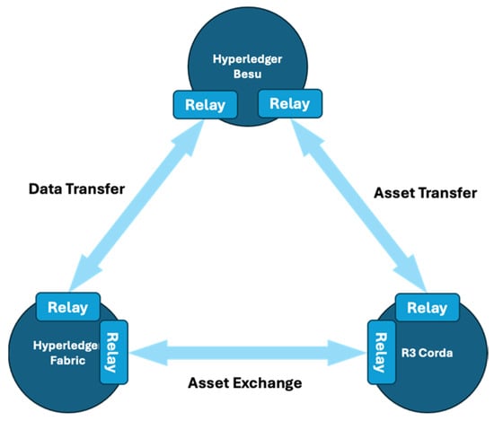- Blockchain-Agnostic Protocols: Build an abstraction layer to communicate and interoperate among diverse blockchains. Building an abstraction layer is essential for defining the solution as centralized or decentralized. In 2019, Abebe et al. [49] proposed a relay component that abstracts the existing blockchain modules from the interoperability layer. The architecture presented in [49] is constructed as a decentralized solution without a trustee and is one of the earliest solutions for permissioned blockchain networks built with Hyperledger [50,51]. The design offered by Abebe et al. also provides a side-by-side architecture and serves as a foundation for future projects using Hyperledger.