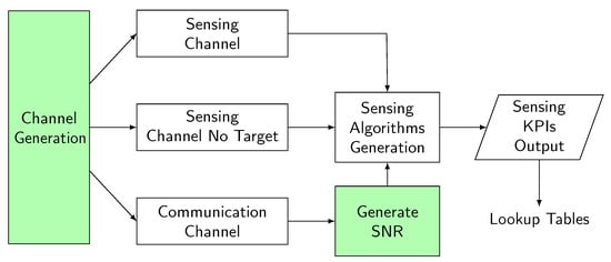 Lookup tables have been widely used for PLA methods like Exponential Effective SNR Mapping (EESM), Effective SNR Mapping (ESM) [,,,], or Mutual Information (MI)-ESM []. These methods have appeared in the predecessor technologies of 4G and 5G. We can rescue from these methods the essential elements considered to perform the link abstraction process: a channel model and an established SNR. These elements form the foundation of our abstraction method. Figure 1 illustrates a flowchart of the proposed approach. In the channel generation component, we have incorporated the creation of communication and sensing channels for the ISAC system. In addition, we have developed a prior knowledge channel, a sensing channel without the presence of the target. Details of this channel generation process will be elaborated on in the following sections.