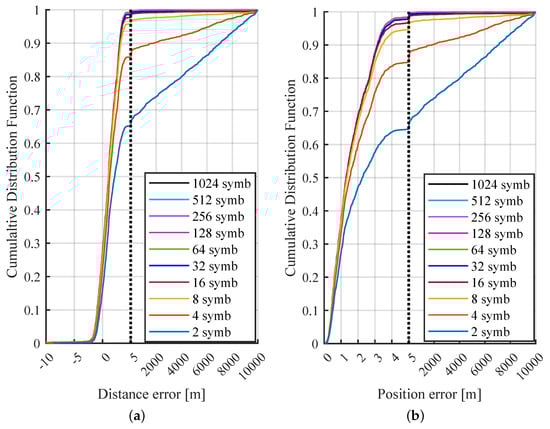 Considering all mapping levels of SNR (ranging from dB to 20 dB) and the full range of OFDM symbol values, the distribution curves exhibit minimal variation in distance and position error cases under target-dominated conditions. This description is illustrated in Figure 4a,b, where legends are omitted since multiple curves represent results across all possible values. This observation indicates that errors consistently follow the same distribution regardless of these two parameters.