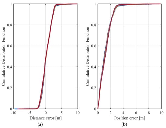 Distance and positioning algorithms are evaluated using KPIs, including mean distance error () and mean positioning error (), as described in Section 2. These metrics can be obtained as