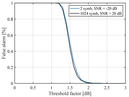 A set of thresholds has been defined by selecting threshold values between 0 dB and 3 dB. The Boolean variable “withTarget” is stored to analyze and later for each simulation seed. Figure 5 shows the curves of the false alarm probability versus the selected threshold factor for two examples corresponding to extreme cases. First, the case where the SNR is dB and the algorithm uses only 2 OFDM symbols and, second, the case where the SNR is 20 dB, and the algorithm uses OFDM symbols. These curves show a notable decay in the false alarm probability as the threshold factor increases.