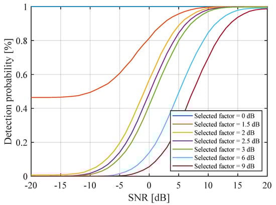 To examine the effect of on the target detection probability, Figure 6 depicts this probability against various selected factors ranging from 0 to 9 dB. A correlation between the false alarm and target detection probabilities can be identified. For example, when dB, the probability of detection and false alarm reach 100%, meaning that the algorithm continuously detects targets even when the target is not present in the scenario. Nevertheless, If the threshold exceeds 3 dB, as shown by the light blue ( dB) and red lines ( dB), we are over-dimensioning the detection. In other words, we are being too strict, which likely increases the likelihood of incorrect detections.