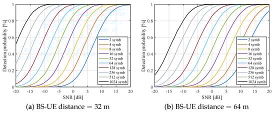 For the abstraction of the target detection algorithm, has been fixed at 3 dB, ensuring a null probability of false alarm. Figure 7 shows a clear relationship between the detection probability and the number of OFDM symbols for a given SNR. Doubling the number of OFDM symbols effectively achieves 3 dB improvement in SNR. Lookup tables illustrating the detection probability across various SNR values and OFDM symbol counts for these thresholds are available in [].