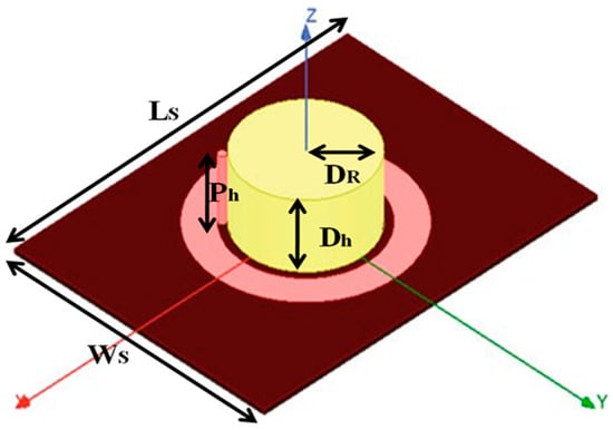 Proposed HDRA Configuration with dimensions (Ls = 60, Ws = 45, h = 0.787, Ph = 8.4, DR = 10, Dh = 10.16). All the dimensions are in “mm”.