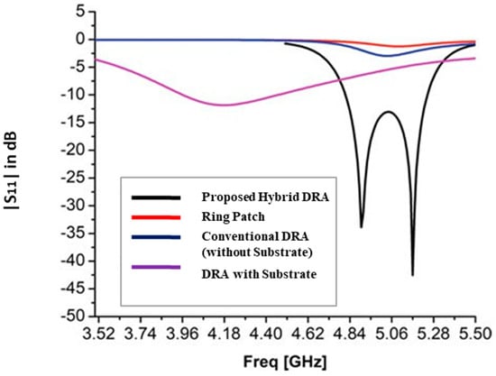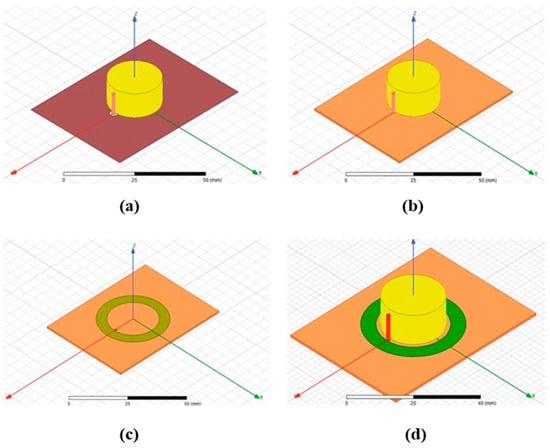 The proposed design and composition of the hybrid DRA is illustrated in Figure 2a–d. Initially, a conventional probe-fed DRA is created for a frequency of 4 GHz, based on the fundamental resonance Equation (1) referenced in []. This design is chosen to transform the traditional cylindrical DRA into a hybrid model that incorporates a probe-feed mechanism, aiming to achieve resonances at 5 GHz, circularly polarized (CP) radiation, and improved gain. A substrate is then introduced between the ground and the DRA to support the ring patch. An independent resonance study of the conventional DRA, the substrate-integrated DRA, the ring patch, and the proposed DRA is carried out to analyze orthogonal mode generation and the variation of S11, as depicted in Figure 3. The fundamental resonance of the conventional probe-fed cylindrical DRA is observed at 3.9 GHz, while the resonance for the substrate-integrated DRA is shifted to 4.15 GHz. The ring patch resonates at 4.9 GHz with a lower return loss of −3 dB. The combination of the ring patch and the cylindrical element, both utilizing a common probe feed, resonates at 5 GHz, producing two orthogonal modes that result in CP radiation. This study reveals a lower resonance due to the high dielectric constant of the dielectric resonator element and a higher resonance attributed to the ring patch on a lower dielectric substrate.