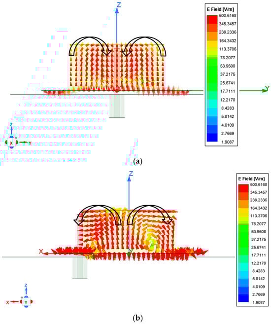 E- Field analysis inside the cylindrical DRA at 4.9 GHz to confirm the two orthogonal modes (a) HEMxδ11 (YZ Plane) and (b) HEMy1δ1 (XZ Plane).