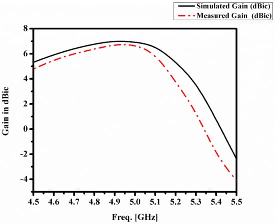 The proposed antenna exhibits a gain of 7.03 dBic, as shown in Figure 10, with an optimized feed position at 90 degrees (rotated clockwise). Figure 11 presents a comparison of the XZ and YZ plane radial plots at 5 GHz, highlighting the similarities between the two patterns. The simulated and measured radiation patterns in the XZ and YZ planes are nearly identical, confirming circular polarization (CP) radiation. A summary of the simulated and measured results can be found in Table 1, and the data shows close agreement between them. The discrepancies observed between the simulated and measured results are attributed to factors such as the manual soldering of the connector to the ground, stacking, and bonding of layers with the substrate.