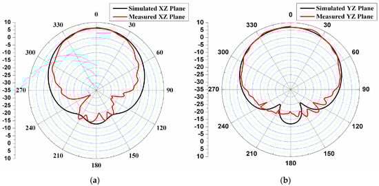 Comparison of simulated and measured radiation pattern plots at 5 GHz (a) XZ planes (b) YZ planes.