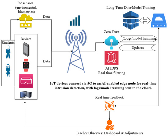 As illustrated in Figure 3, a proposed 5G-enabled school network architecture should integrate a firewall and AI-driven Intrusion Detection and Prevention System (IDPS) for real-time zero-trust security. Traffic from the Internet and 5G tower passes through the firewall and IDPS, which applies continuous authentication and threat mitigation. A core switch then routes data to distinct VLAN segments for management, guests, faculty, and students, each served by dedicated edge switches. This segmentation isolates high-bandwidth IoT devices, VR/AR headsets, and personal computers (PCs) while enabling Wi-Fi for mobile users. Logs and model updates are sent to a cloud infrastructure for advanced analytics, enhancing both security and adaptive learning features.