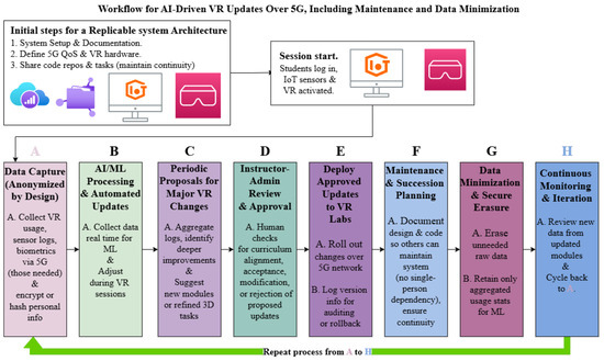 The outlined proposed workflow of a VR STEM class guarantees a manageable long-term system alongside strong data security while effectively incorporating AI-driven real-time updates within a 5G-enabled VR environment.
