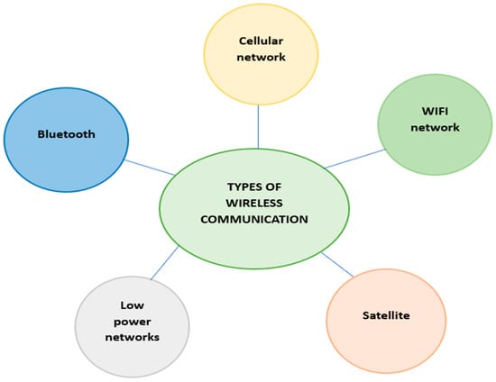 Wireless communication networks transmit data through electromagnetic waves instead of using physical cables. Wireless communication networks have emerged as a dominant force, supplanting wired connections in many applications [,]. Leveraging radio waves for data transmission, these networks offer unparalleled flexibility and mobility, enabling communication between devices without physical cables. This technology has fostered significant advancements in areas like mobile computing, internet access, and home automation, fundamentally altering how we connect and share information in the modern world []. Figure 1 shows the different types of wireless communication systems.