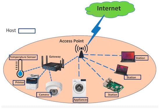 Wi-Fi networks, often referred to as Wireless Fidelity networks, are a type of wireless local area network (LAN) technology that enables devices to connect to the internet and communicate with one another wirelessly inside a constrained space [,,]. Wi-Fi networks are secured through protocols such as WPA, WPA2, and WPA3, ensuring data encryption and connection safety. Wi-Fi is frequently used to wirelessly connect devices like smartphones, computers, tablets, and smart home appliances to the internet in homes, offices, public spaces, and various other locations, as shown in Figure 3 [,]. Recent advancements, such as mesh networks for eliminating dead zones, highlight the pivotal role of Wi-Fi in enabling modern communication and supporting the growth of smart technologies.