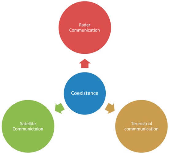 Figure 5 illustrates the coexistence of the following three major communication systems: radar communication, terrestrial communication, and satellite communication. The central “Coexistence” node signifies the interplay and spectrum sharing between these technologies. The arrows indicate bidirectional interactions, showing how each system influences and depends on others.