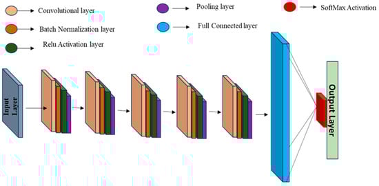 Convolutional Neural Network (CNN)-based techniques for interference reduction and denoising in [] produce promising performance outcomes for radar processing. Nevertheless, these models usually require more memory to operate because they have millions of parameters that are kept in hundreds of megabytes of memory [,,]. Previously, studied examined quantization methods for CNN-based radar signal denoising and interference reduction. These studied investigated the potential of various CNN architectures and sizes for quantization by employing piecewise constant activation functions and quantized weights. This approach aims to reduce memory consumption during both model storage and inference. Figure 6 represents a deep learning-based interference mitigation model designed to process and reduce noise in communication signals. The input layer receives raw signals, which pass through multiple convolutional and feature extraction layers that identify interference patterns. These layers apply filtering, normalization, and activation functions to suppress interference while preserving the original signal. The final output layer produces a refined signal with minimized interference, enhancing communication reliability.