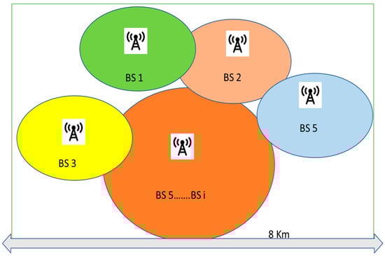 Two channel assignment algorithms for maximizing multicast coverage in terrestrial networks are analyzed in []. The study investigates the interactions and coexistence of different channel assignment systems operating within the same area and spectrum. Multiple base stations within a common service area are considered, and network performance is evaluated based on the coverage area and the signal-to-interference-plus-noise ratio (SINR). It has been demonstrated that combining different schemes can be beneficial, since blended systems can benefit from the best aspects of each plan. A coexistence test scenario was established across multiple channels with randomly positioned terrestrial base stations to simplify the analysis. Figure 8 represents a base station (BS) coverage and coexistence model, illustrating the overlapping service areas of multiple base stations. Each colored region represents the coverage area of a different BS (BS1, BS2, BS3, BS5, etc.), highlighting how multiple base stations coexist within an 8 km radius. Larger coverage areas, such as BS 5…BS i, indicate extended network service regions, while smaller zones represent localized base stations that provide targeted connectivity. The overlapping areas suggest potential interference zones, where multiple BS signals interact, requiring efficient frequency management and interference mitigation techniques to maintain seamless communication.
