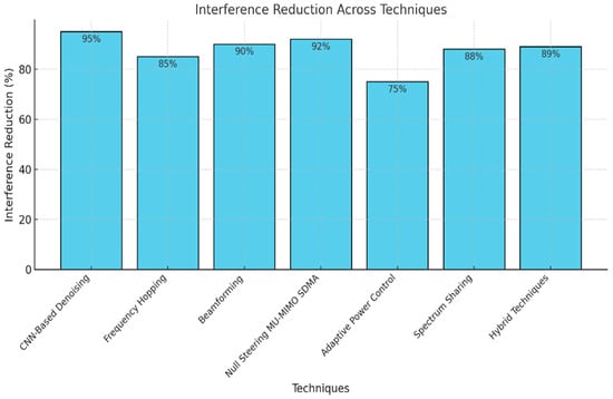 The bar graph with the interference reduction is shown in Figure 9. CNN-based denoising offers the highest interference reduction (95%) but demands high computational resources, making it ideal for radar and wireless systems. Techniques like beamforming and null steering provide strong performance (90–92%) for high-precision applications, while adaptive power control (75%) suits low-complexity scenarios like cellular networks.
