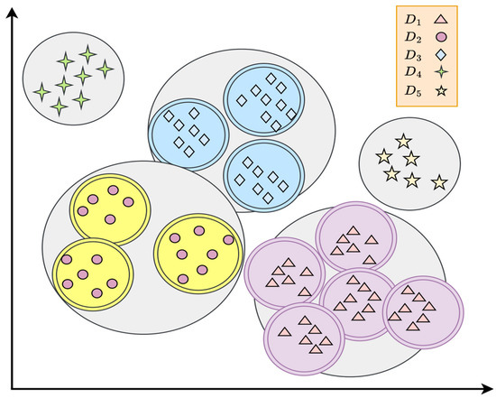 The present article proposes a classification method based on the optimal partitioning (OP) and Extreme Learning Machine (ELM) [10] techniques for the identification of BGP anomalies with improved performance. The proposed method provides a practical solution to dataset imbalance by splitting classes with greater numbers of samples into several segments of smaller-sized subgroups and thereby making the distribution of samples even across the dataset. This segmentation is achieved through the use of OP, which facilitates classifying the samples from large classes into disconnected clusters, each of which is similar in size to the class with fewer samples. This approach leads to a more even distribution of the detection of anomalies inside BGP networks. The original concept for dividing samples from majority sample classes is taken from [11]; however, in this work, we extended the concept by applying the partitioning to multiple classes with higher numbers of samples. Furthermore, instead of using affinity propagation (AP) for partitioning the samples in this work, the optimal partitioning (OP) method based on Gray Wolf Optimization (GWO) [12] was utilized. Through this approach, classes with larger samples (major classes) are split into multiple clusters, and the clusters are assigned unique class IDs, which essentially makes them distinct sub-classes. These sub-classes together with the original classes with small numbers of samples (minor classes) are used for the Extreme Learning Machine (ELM) training. Figure 1 reveals the technique of deriving sub-classes from the major classes and merging them with the minor classes for the purpose of training the ELM. Here, the first dataset is divided into five classes, up to , whose sample counts are , , , , and , respectively. The unequal proportions of samples are illustrated by relatively more samples in , , and compared to in and , which separately have fewer sample counts. For achieving uniform distribution, the method starts off by computing the mean number of samples per class, which is represented by the following equation: