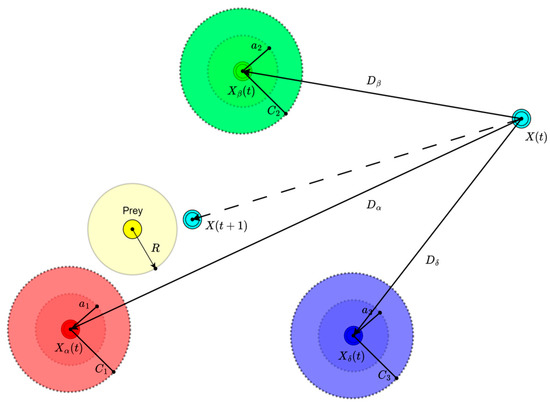 The wolves update their positions towards the prey (optimal solution), influenced by the positions of the , , and wolves that are presented in Figure 3.