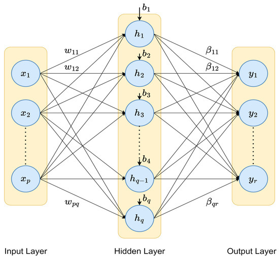 Hidden Layer: The hidden layer has a set of neurons, each with a random weight and bias connected to every input neuron. The weights are denoted by , where indexes the input neurons and indexes the hidden neurons. The biases are denoted as , , …, for hidden neurons. The output of the hidden neuron, denoted as , is calculated using the activation function ():