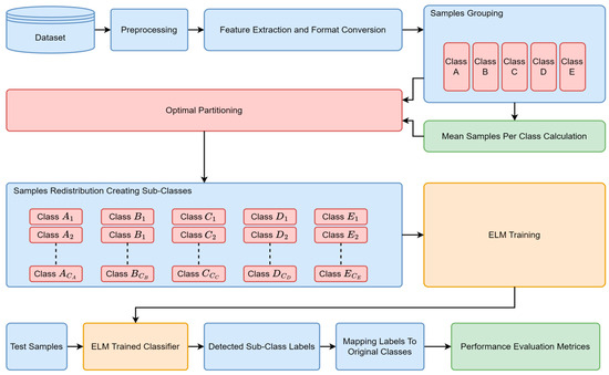 Utilizing the mean sample size per class () as a standard comparator, the majority classes with sample counts higher than are divided into a number of sub-classes through optimal partitioning (OP). This implies that the distribution of the samples for the unbalanced classes will be brought back to its level in the former dataset because now the dataset has over five classes. The advantage of subdividing the larger sample size classes is also illustrated in Figure 2. It is important to note that these sub-classes serve a temporary role in the classification process. They are merged back to the initial classes of the classifier before the last phase of outputting. The outcome labels of the classifier are the original input labels.