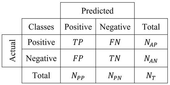 The utilization of performance indicators is very helpful in analyzing the performance of any machine learning model. These indicators assist with comparing different classification approaches and machine learning techniques. The testing capability of different classifiers is observed on the basis of evaluation metrics. The confusion matrix is one of them and is responsible for the relevant information obtained from the algorithm. In Figure 6, a two-class confusion matrix is shown based on this matrix, and the four common measures are given as follows: