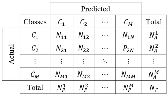 These measurements can be extended for multiclass scenarios [43,44]. However, this first requires the expansion of the two-class confusion matrix into classes, as presented in Figure 7. In the figure, the term denotes the number of class instances that are classified as class instances.