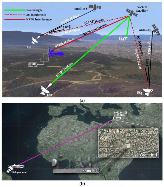 The four earth stations (ES1 to ES4) communicate with three GEO satellites: satellite 1 (S1), the victim satellite (S2), and satellite 3 (S3). Adjacent satellites are spaced 2 degrees apart, as seen from any corresponding ES, as set by the International Telecommunication Union (ITU) [16,17]. In this scenario, the desired signal is transmitted from ES2 towards S2. Satellite S2 retransmits the signal back to ES4, as shown in Figure 1a. This signal suffers from interference. Satellite S2 considered in this study is the IS-1002 located at 35° west. This satellite provides coverage to the area under study (Lebanon) [4].