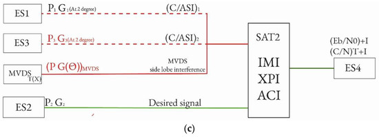 In addition, we will consider that ASI, self-interference (including intermodulation, adjacent channel interference, and cross-polarization interference), and MVDS interference all combine to destructively affect the received signal at ES4. This worst-case scenario aims to evaluate the desired signal in a possible realistic setting and will help identify the most reliable recommendations and solutions to mitigate the interference (as shown in the planner block diagram Figure 1c of Figure 1a, which shows all the important parameters).