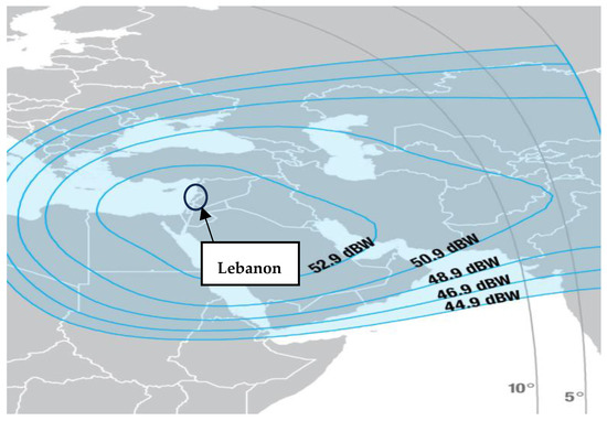 The lowest satellite elevation observed in Beirut, located at 35 degrees east longitude, has a footprint that covers the city. The satellite’s footprint coverage is shown in Figure 2 [21]. S2 has a figure of merit of 5.6 dB/K in the coverage region where Lebanon is located.