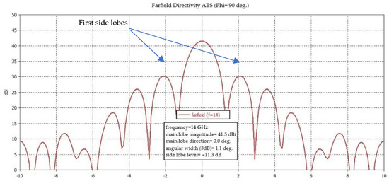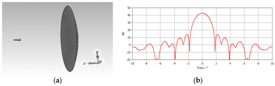 The antenna is designed and optimized using computer simulation technology (CST) software (Figure 6a). The new antenna has a diameter of 1.1 m. The far-field pattern of the proposed antenna is shown in Figure 6b. The plot shows that the proposed antenna achieves a main lobe magnitude of 42 dB, which is comparable to the 41.5 dB of the currently used antenna, ensuring that the signal strength in the intended coverage area (MVDS customers in Beirut) is maintained. The 3 dB angular width of the main lobe is 1.4 degrees, a slight increase from the current 1.1 degrees. The most significant improvement is observed in the side lobe levels. The proposed antenna exhibits a side lobe level of −28.7 dB relative to the main lobe. This translates to a first side lobe gain of approximately 13.9 dB, a substantial reduction of over 16 dB compared to the first side lobe gain of the currently used antenna (approximately 30.2 dB).
