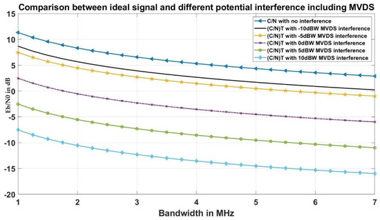 This section presents the results of the interference analysis conducted based on the system model and mathematical frameworks detailed in the previous sections. We will explore various cases to quantify the impact of different interference sources on the GEO satellite system. The satellite uplink and downlink specifications are listed in Table 3. Initially, we will establish a baseline by examining an ideal scenario devoid of interference. Subsequently, we will present the results obtained when considering adjacent satellite interference (ASI) and then the specific interference arising from MVDS transmissions.