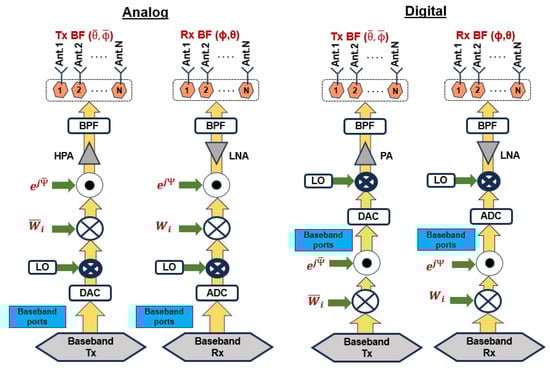 Figure 1 illustrates the structure of a smart antenna, which consists of an array of antennas, including both analog and digital low noise amplifiers (LNAs), a high-power amplifier (HPA), a power amplifier (PA), an analog-to-digital Converter (ADC), a digital-to-analog converter (DAC), a local oscillator (LO) for baseband transmission (Tx) and reception (Rx), and the weights for antenna array synthesis. The antenna array synthesis involves adjusting the weights applied to each antenna element to optimize the overall radiation pattern and performance of the system for various communication or sensing applications, based on the architecture proposed by Prof. A. Manikas [32].