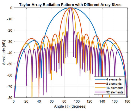 Thus, increasing the number of elements in the array results in a narrower beam and better angular resolution, but it also requires optimal element spacing to avoid the formation of grating lobes. If the element spacing, d, exceeds , unwanted side lobes, or grating lobes, may appear, leading to detection errors. To mitigate these effects, windowing functions such as Taylor, Chebyshev, or Hamming windows are applied to reduce side lobes, optimizing radar performance without significantly increasing the main beam width [26,27]. Among these, Taylor-series expansion is favored in this work due to its analytical tractability and ability to produce physically interpretable excitation profiles with controlled sidelobe behavior. Unlike Chebyshev- or Fourier-based designs, Taylor excitation enables the smooth tapering of the amplitude distribution, which integrates naturally with neural network optimization and facilitates convergence. This balance between simplicity, control, and compatibility with data-driven tuning makes Taylor series a strong candidate for hybrid synthesis frameworks.