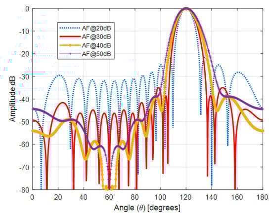 Phased-array radars use antenna arrays that can be electronically controlled to steer the radar beam without mechanical movement, enabling fast scanning and efficient target detection and tracking. The array factor () plays a crucial role in beamforming and is defined as the sum of contributions from each antenna element in the array, where each element is fed with a phase-adjusted signal [22,23]. For a linear array of N elements spaced with d, the array factor is given by the following: