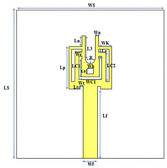 The antenna is fed via a 50 microstrip transmission line to ensure optimal impedance matching with high-frequency circuitry. Its structural design features a rectangular patch geometry with a radiating element of width W and length L, carefully determined using classical analytical models for microstrip patch antennas. The slot dimensions were empirically adjusted to support the dual-band response and ensure proper impedance matching.