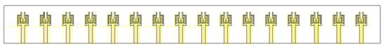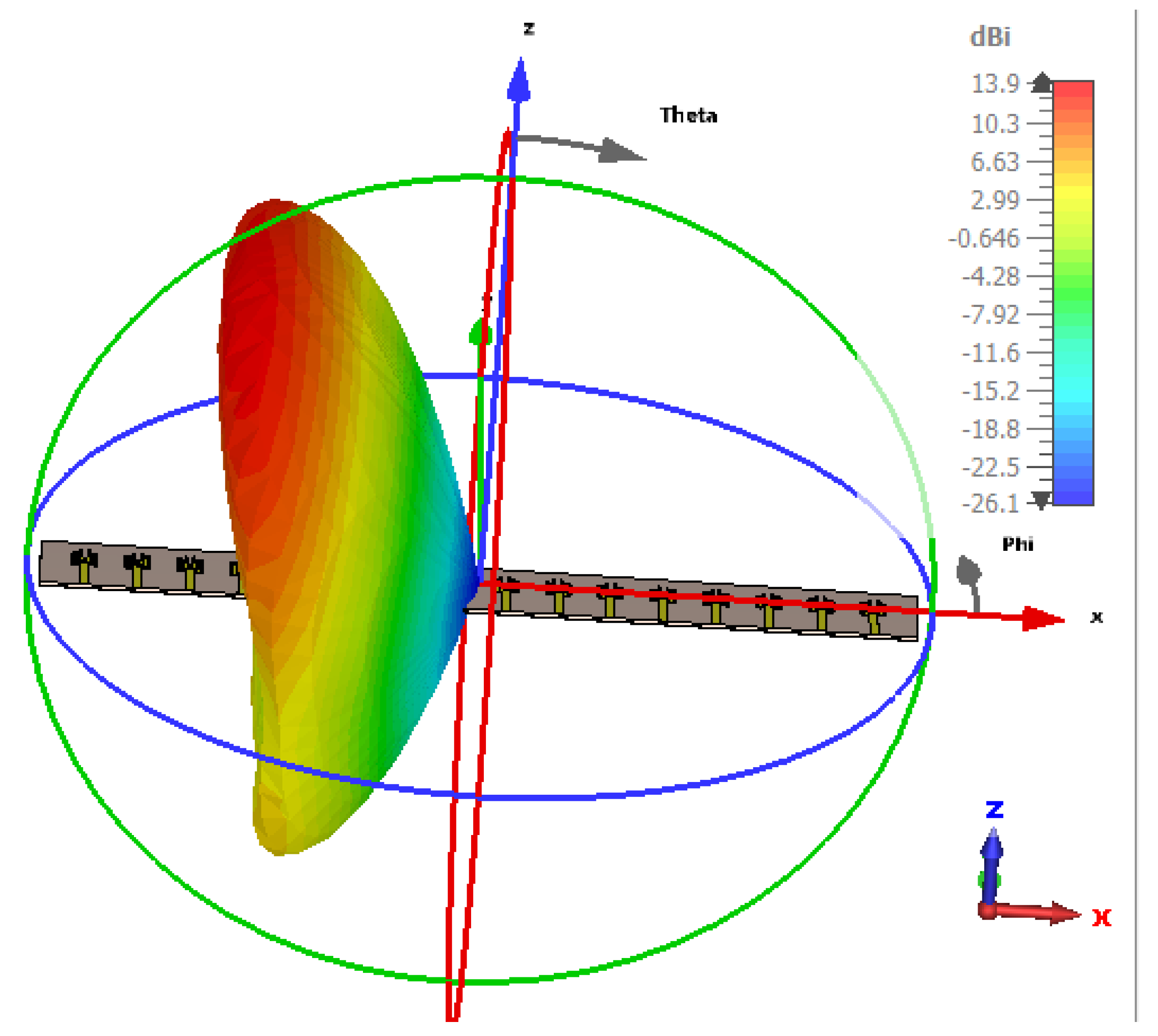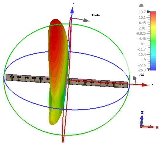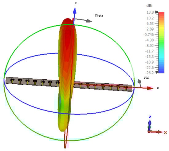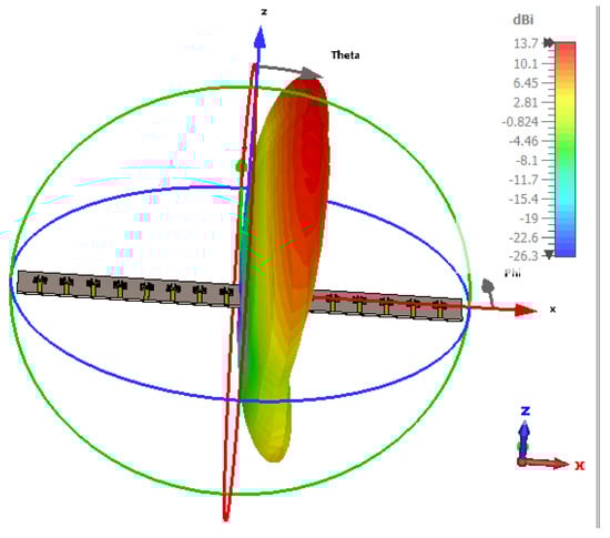 The simulated antenna consists of 16 identical microstrip patch elements arranged in a uniform linear array with spacing. This structure serves as the physical basis for the optimization framework and simulation results presented in Figure 2, Figure 3, Figure 4 and Figure 5. The Taylor method is a classical technique used in antenna array design to control how energy is distributed across the radiation pattern. It enables designers to fine-tune parameters such as beamwidth and sidelobe level by adjusting excitation amplitudes across the array elements using a mathematical series expansion. When a precise expression of the electromagnetic field is not easily available, Taylor expansion allows engineers to locally approximate the field distribution and apply optimized amplitude weights to shape the desired beam [25,33,34,35].