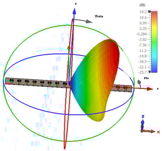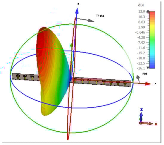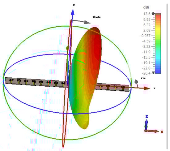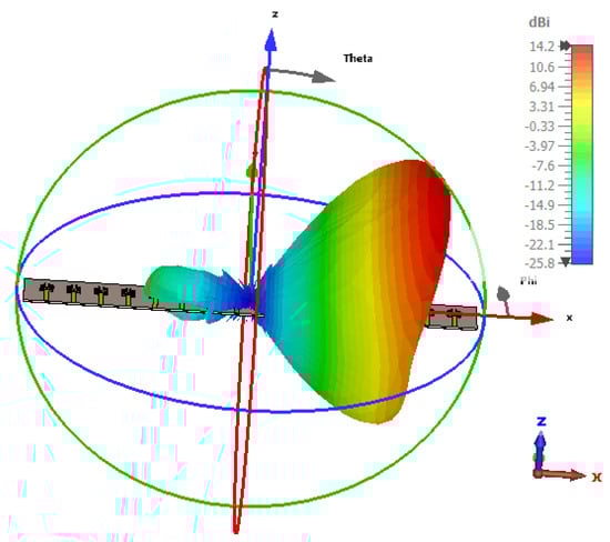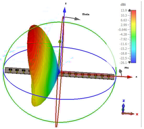 where is the wave number, is the wavelength of the radar signal, is the observation angle, and is the phase shift applied to each antenna element. In the case of a linear phase shift with an angle, , of the main beam direction, each element receives a phase, , where is the direction of the main beam. This allows the beam to be steered towards without requiring the physical movement of the antennas [24,25].