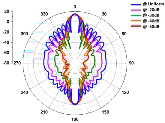 This second table shows the synthesized excitation weights for each element at different sidelobe levels (−20 dB, −30 dB, −40 dB, and −50 dB), where the Taylor method tailors the amplitude distribution across the array. As the sidelobe levels are reduced, the weight distribution becomes more concentrated toward the central elements, further enhancing the array’s ability to focus energy and reduce interference, thus optimizing the radiation pattern for applications like radar, communication, and satellite systems.