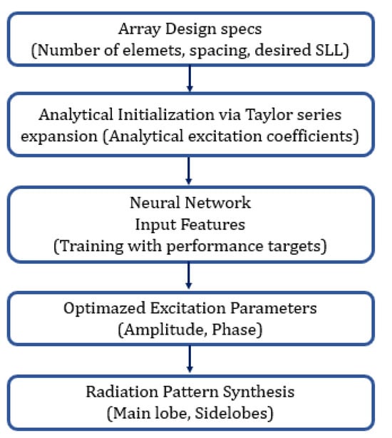 At its core, the Taylor method, founded on mathematical principles, provides engineers with a robust framework for approximating complex functions through series expansions. Within the context of antenna arrays, this method enables the manipulation of radiation patterns by fine-tuning polynomial coefficients, affording precise control over crucial parameters like beamwidth, sidelobe levels, and null steering [2,3]. Complementing this mathematical prowess, neural networks harness their intrinsic learning capabilities to optimize these coefficients based on desired radiation patterns [4,5]. Through iterative training processes, neural networks iteratively adjust the Taylor-series coefficients to minimize discrepancies between predicted and desired radiation patterns, refining their understanding with each iteration. This collaborative optimization process enables antenna arrays to achieve remarkable levels of performance across a myriad of applications. For instance, in beamforming, this integrated approach facilitates the precise steering of radiation beams towards specific directions while mitigating interference from undesired sources, enhancing signal quality and coverage. Furthermore, it enables the customization of radiation patterns to suit diverse application requirements, such as minimizing sidelobes for radar systems or optimizing coverage patterns for wireless communication networks [6,7]. Unlike previous methods that treat analytical and machine learning techniques separately, this work introduces a hybrid synthesis framework where Taylor series-based excitation is used to guide and initialize a neural network model, resulting in enhanced optimization and interpretability. Additionally, in environments prone to interference, adaptive antenna arrays equipped with neural networks can dynamically adjust radiation patterns in real time to mitigate interference sources, ensuring robust performance even in challenging operating conditions. Overall, the integration of the Taylor method with neural networks empowers antenna arrays with unparalleled levels of performance, adaptability, and versatility, driving transformative advancements in wireless communication, radar systems, and beyond.