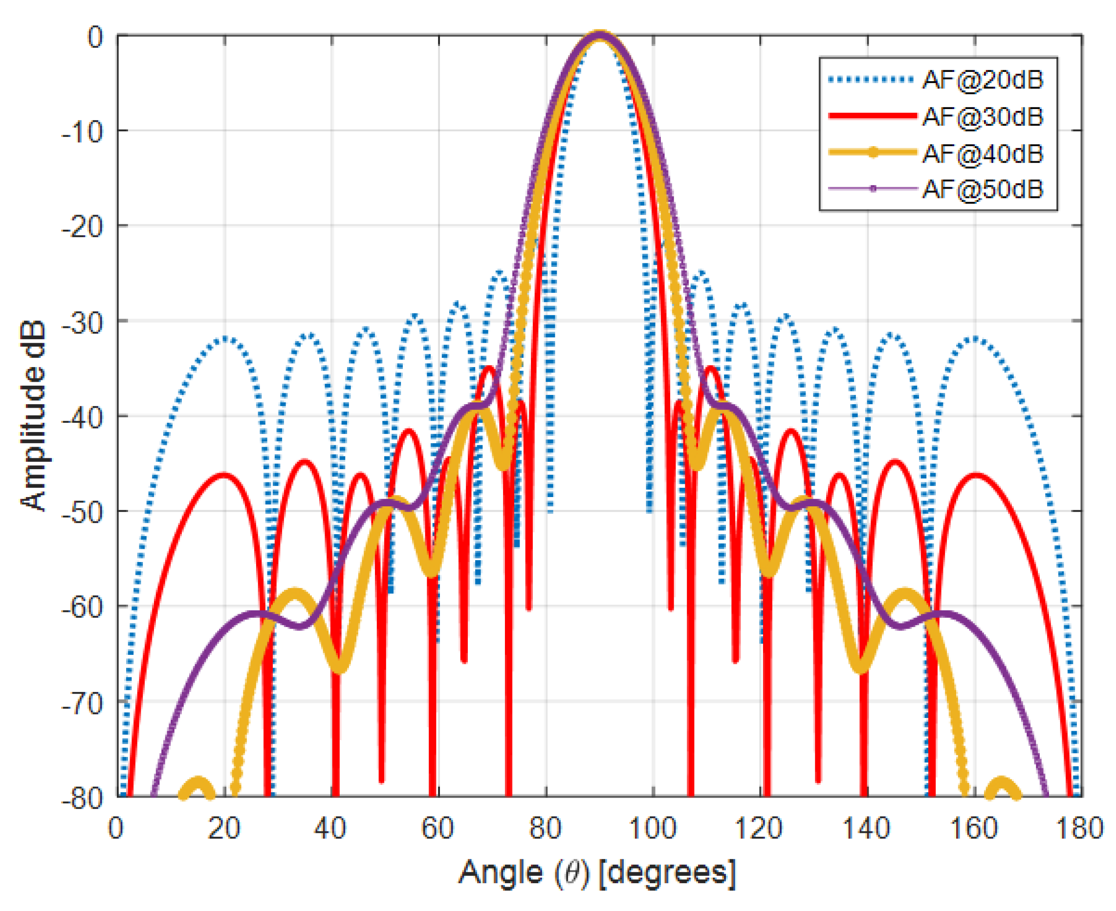 To achieve the specified side lobe levels (−20 dB, −30 dB, −40 dB, and −50 dB), amplitude tapering among the elements is optimized using Taylor distributions. This optimization ensures that the radiation pattern meets the desired sidelobe levels. The main lobe width can be adjusted accordingly during the optimization process to meet any specific requirements. Finally, the array factor representing the radiation pattern is computed, followed by simulation and iterative optimization using MATLAB R2023a until meeting the specified design criteria [47].