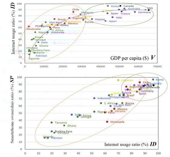 Aiming at examining the effects of leapfrogging, the correlation between growth (V), Internet use (ID), and smartphone dependence (SP) in 39 countries in the north and the south as tabulated in Table 2 and Table 3 is illustrated in Figure 2 [19].