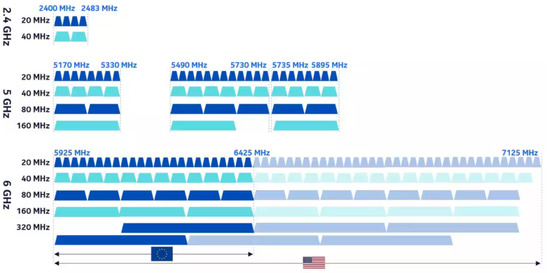 Spectral allocation of 20 MHz Wi-Fi channels and their aggregation into 40, 80, 160, and 320 MHz bonded groups across the 2.4 GHz, 5 GHz, and 6 GHz frequency bands [22].