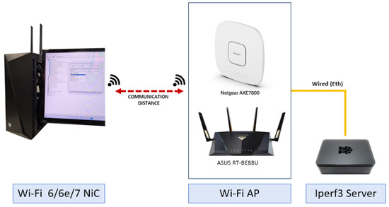 Performance measurements are performed using iperf3, a widely adopted tool for precise network throughput, latency, and jitter analysis. A Raspberry Pi connected via Ethernet is designated as the server to provide a stable, low-latency endpoint, minimising external variability. The desktop computer, acting as the client, generates Wi-Fi traffic, ensuring that performance metrics accurately reflect wireless link behaviour without interference from wired network inconsistencies. This experimental setup ensures a controlled environment for evaluating the efficiency and stability of Wi-Fi technologies in real-world deployment scenarios.