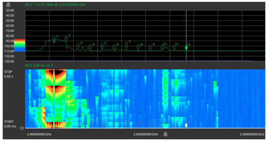 For example, the spectrogram shown in Figure 3 captures the activity of the 2.4 GHz band, displaying a 100 MHz bandwidth analysis, spanning from 2.4 to 2.5 GHz, divided into 10 MHz slots for enhanced visualisation. The temporal representation covers 6 s, with millisecond resolution, allowing observation of the spectrum’s dynamics. A high concentration of activity, characterised by a transition from blue to red (low to high saturation), is evident in the first 30 MHz of the spectrum, indicating the intensive use of Wi-Fi channels 1–3 and consequent congestion. Moving toward higher frequencies, the activity decreases, showing weaker and more intermittent signals, suggesting the presence of other networks or interferences with less impact. This information is crucial for optimising the Wi-Fi network, enabling the selection of channels that are less congested and minimising interference. Consequently, spectrogram analysis was used to estimate the percentage of the spectrum occupied by interfering networks.