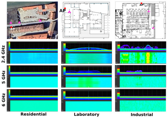The selected environments correspond to three typical Wi-Fi network deployment zones, each chosen to represent varying levels of spectrum saturation. These differences arise due to the distinct characteristics of each environment, such as the density of wireless devices, the number of overlapping networks, and the presence of external interference sources. Evaluating these diverse conditions enables a comprehensive analysis of the performance of different IEEE 802.11 technologies under real-world interference and congestion scenarios. To quantify these differences and better understand the spectrum conditions in each environment, a spectrum analysis was conducted.