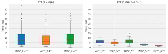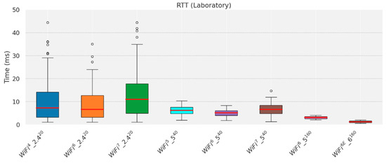 The performance assessment was carried out by measuring the RTT between a Wi-Fi client, operating on a desktop computer, and the associated access point, as depicted in Figure 2. The results were independently analysed for each of the three environments considered. Data visualisation was performed using box-and-whisker plots, where the results from all three test iterations were aggregated to enhance clarity. These plots illustrate the maximum (), minimum (), and mean () RTT values, with the mean denoted by a red horizontal line.