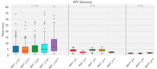 The results are arranged from left to right in ascending order of frequency. As shown in Figure 5, the highest RTT levels are observed in the 2.4 GHz band, which has the highest number of interfering signals. This saturation of the spectrum is observed both in high values of the mean deviation of the RTT in Figure 5 and in the spectrogram in Figure 4 for the laboratory environment.