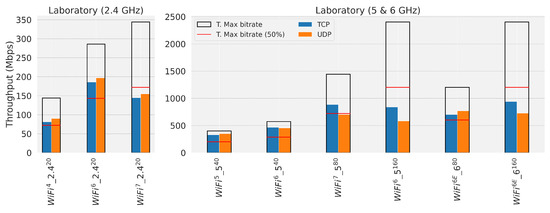 For this environment, which presents higher spectrum saturation in the 2.4 GHz and 5 GHz bands, all technologies detailed in Table 3 have been evaluated. The results are presented separately in Figure 8 to account for the distinct performance characteristics of each frequency band. Specifically, on the left side of Figure 8, the results obtained for the 2.4 GHz band are shown, while on the right side, results for the 5 GHz and 6 GHz bands are shown. In the 2.4 GHz band, it is observed that the results for WiFi_2.4 technology are slightly lower than those for WiFi_2.4 technology. This result demonstrates that, even under optimal conditions, the achieved bitrates are at least 30% lower than the theoretical maximum bitrate. In the 5GHz band, better results are obtained with WiFi_5 technology than with WiFi_5. On the other hand, it is worth noting high peak throughput results obtained in both 5GHz and 6 GHz bands due to low or no spectrum saturation in this environment, reaching up to 940 Mbps with WiFi_6 technology.